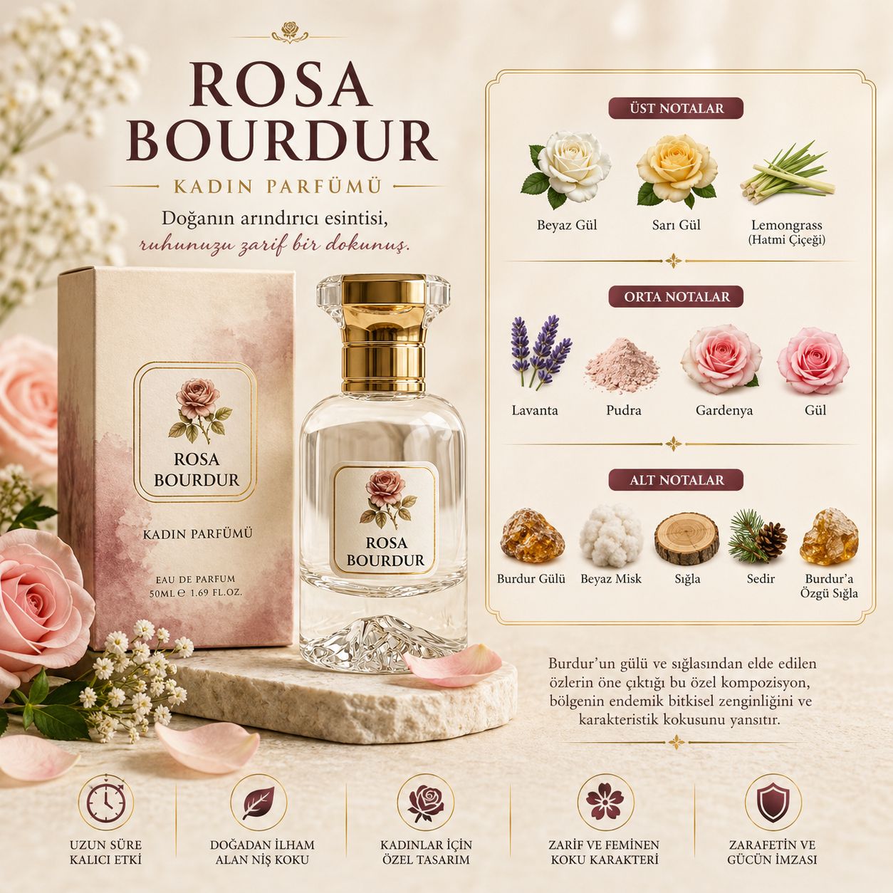 Alt Notalar (Derinlik): Siyah Gül, Beyaz Misk, Burdur’a özgü Sığla ve Sedir ağacı ile kalıcı, asil ve gizemli bir kapanış.